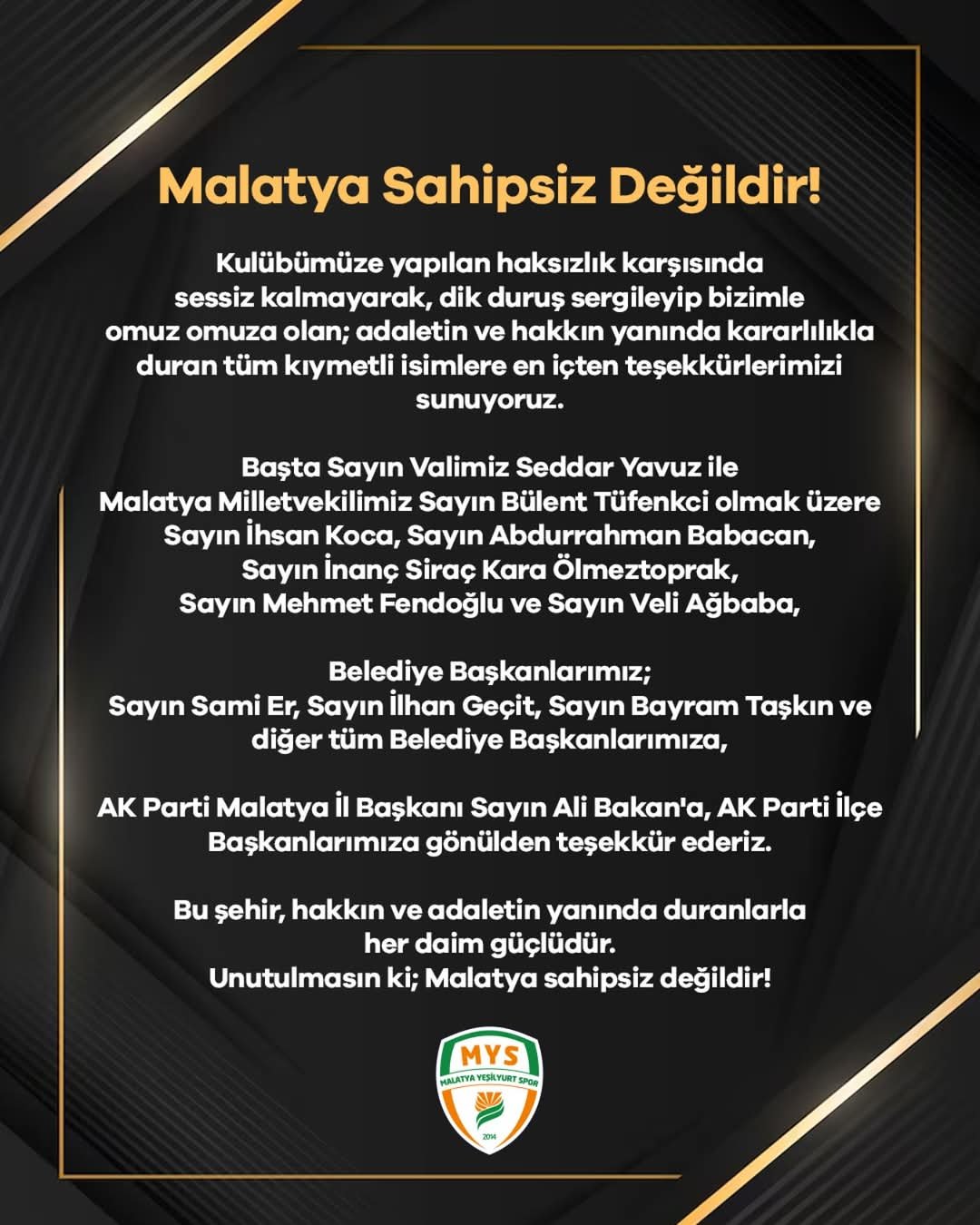 Malatya Yeşilyurt Spor Kulübü yapılan haksızlık karşısında yek vücut olmasıdır.